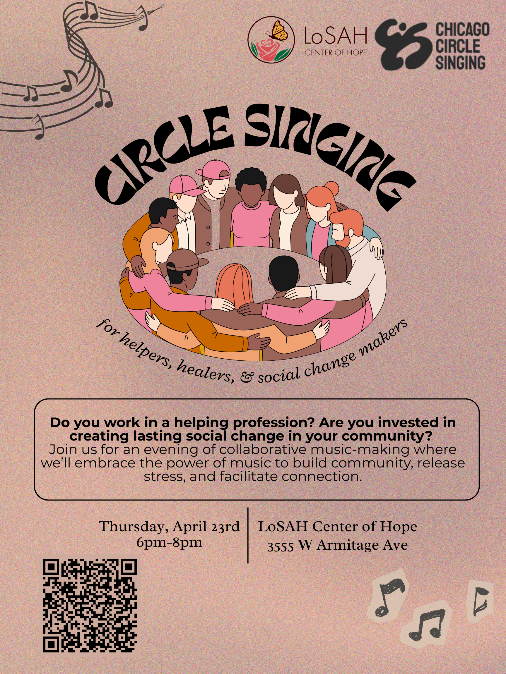 Join the LoSAH Center of Hope and songleader Davin Youngs of Chicago Circle Singing for an evening of collaborative music making and connection. Intended for folks who work in helping or social impact professions, this event will foster a restorative space to let go and play.